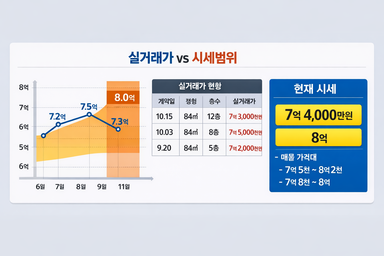 실전에서는 이렇게 보시면 됩니다. 최근 실거래가가 예를 들어 7억 후반~8억 초반에 형성돼 있는데, 현재 매물이 8억 8천에 나와 있다면 그 차이가 단순히 “비싼 호가”인지, 아니면 고층·수리·입주 가능 같은 조건 프리미엄이 붙은 것인지 하나씩 따져보는 방식입니다.