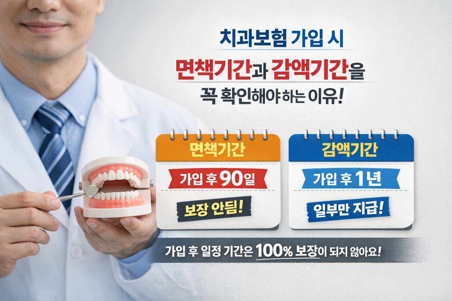 치아보험은 가입하자마자 바로 100% 보장된다고 생각하면 안 됩니다. 상품에 따라 일정 기간은 보험금이 아예 지급되지 않는 면책기간이 있을 수 있고, 그 이후에도 한동안은 보험금이 전액이 아니라 일부만 나오는 감액기간이 붙을 수 있어요.