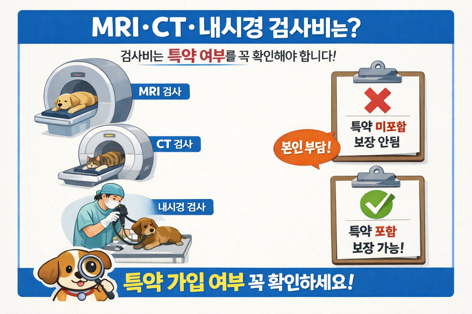이 말은 곧 검사비가 상품에 따라 기본 보장처럼 보일 수도 있지만, 실제로는 특약 구조인지, 어떤 검사까지 포함되는지, 질병 치료 목적 검사만 해당되는지 확인해야 한다는 뜻입니다. 그래서 펫보험을 비교할 때는 단순히 ‘수술 된다’보다 수술 전 검사비까지 같이 되는지를 꼭 따져보는 게 현실적입니다.
