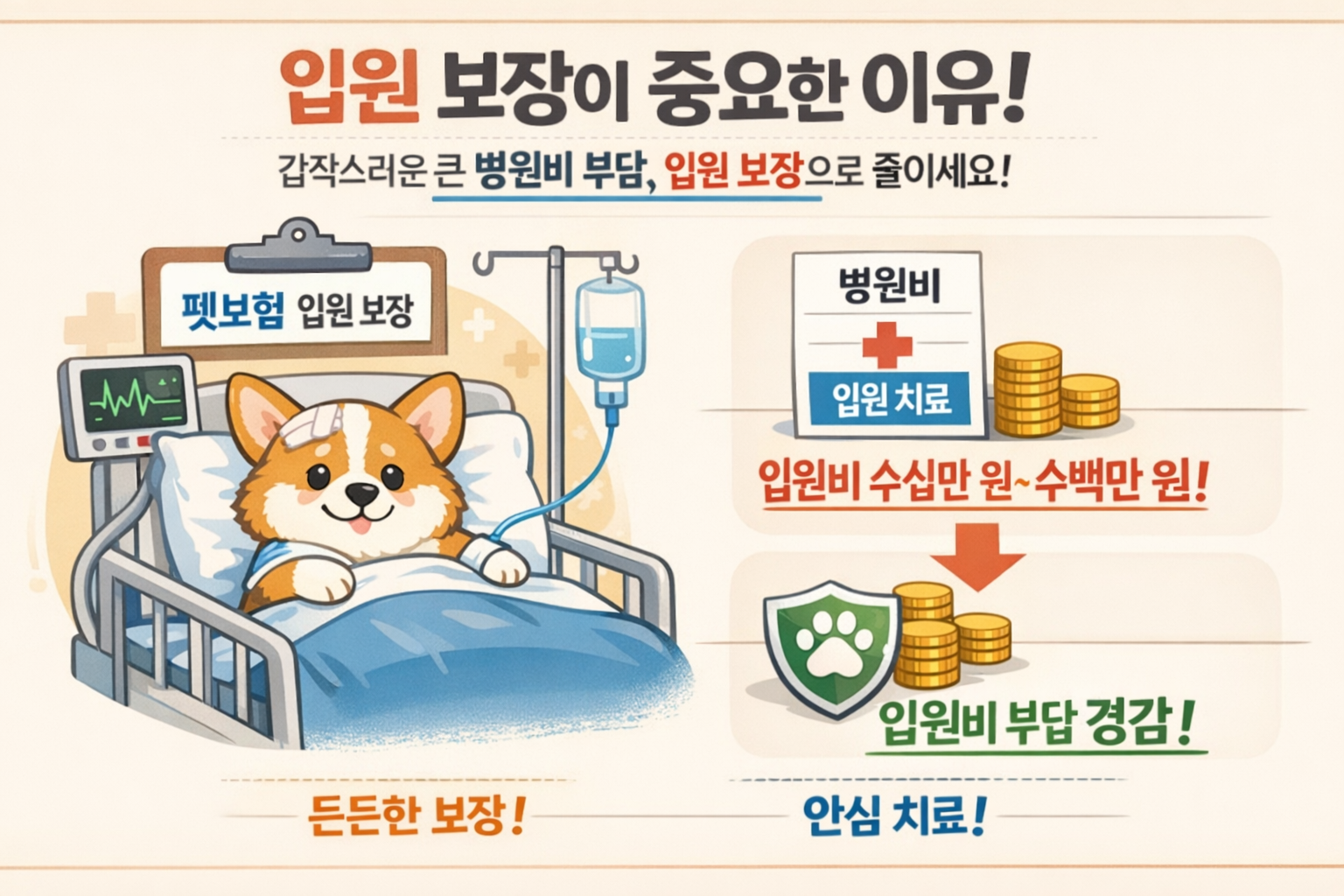 입원은 통원보다 빈도는 낮을 수 있지만, 한 번 발생하면 비용 부담이 훨씬 커질 수 있는 항목입니다. 수액 처치, 집중 관찰, 입원실 비용, 반복 검사 등이 함께 붙을 수 있어서 보호자 입장에서는 보험이 가장 절실하게 느껴지는 구간이기도 해요.