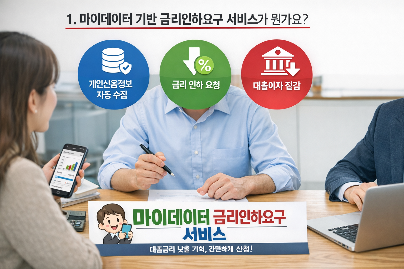 오늘은 마이데이터 기반 금리인하요구 서비스가 정확히 무엇인지, 그리고 기존 금리인하요구권과 비교해서 뭐가 달라졌는지를 쉽게 정리해보려고 합니다. 요즘 대출이 있는 분들은 “금리가 조금이라도 내려가면 좋겠다”는 생각을 한 번쯤 하시는데요. 문제는 내가 직접 신청해야 하고, 언제 신청해야 유리한지 모르겠고, 승인 가능성이 있는지도 애매해서 그냥 넘어가는 경우가 많았다는 점입니다. 그런데 이번에는 마이데이터를 활용해서 내가 일일이 챙기지 않아도 금리인하 가능 시점을 자동으로 잡아주는 서비스가 나왔기 때문에, 대출이 있는 분들이라면 꼭 한 번 이해해둘 필요가 있습니다.