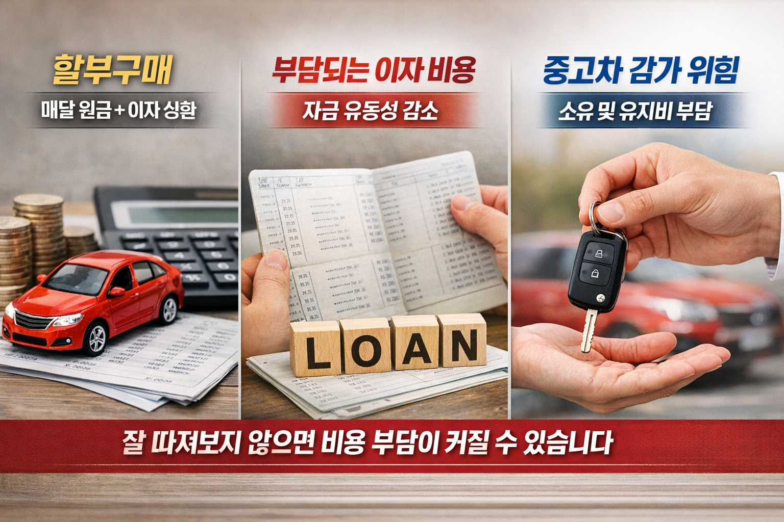 예를 들어 월 할부금만 보면 괜찮아 보여도, 보험료와 세금까지 합치면 예상보다 매달 나가는 돈이 커지는 경우가 많습니다. 그래서 할부는 “내 차를 갖고 싶다”는 만족감은 크지만, 부대비용까지 함께 감당할 수 있는지를 꼭 따져봐야 합니다.