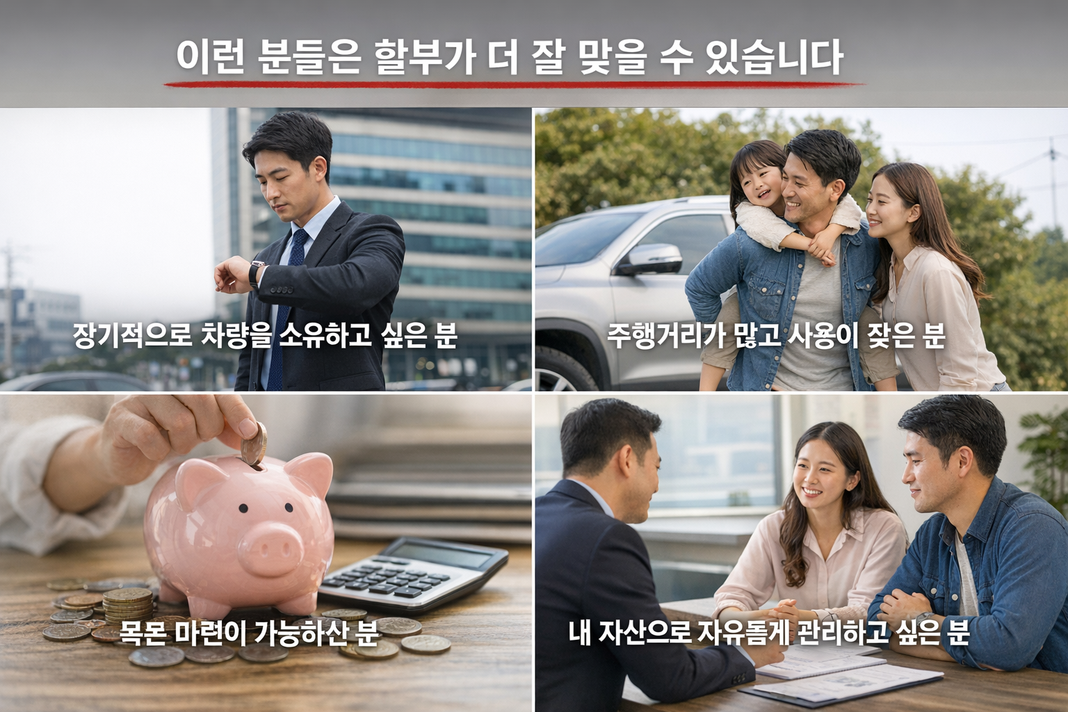 | 잘 맞는 사람 | 오래 탈 사람 | 사업자·주기적 교체 선호층 | 관리 편의 중시, 초보 운전자 |