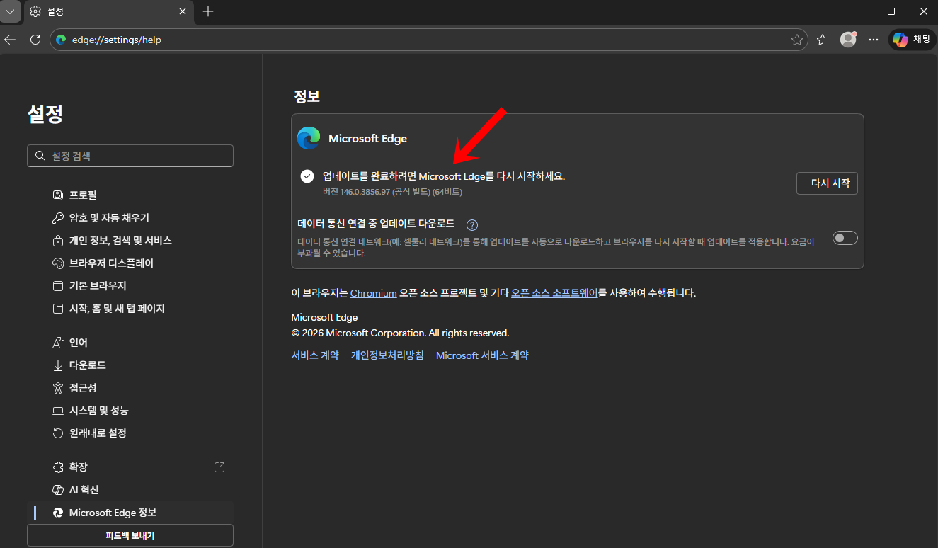 제 PC의 에지 버전을 보게 되면 146 버전인데요. 이 버전을 다운그레이드하여 낮춰보도록 할게요.