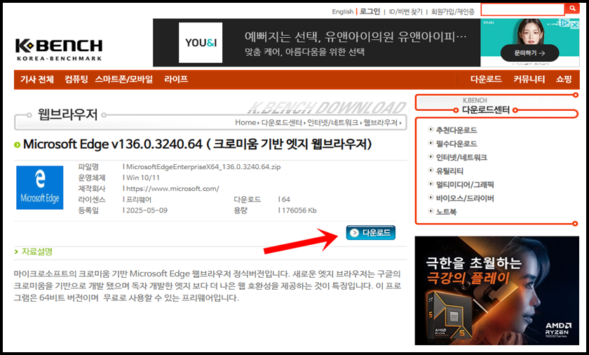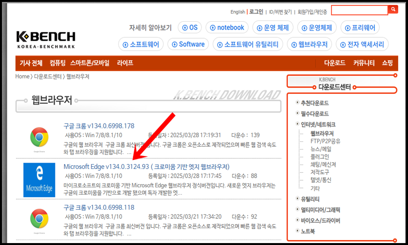 저는 MS공식폼페이지에 없는 136 버전으로 다운그레이드를 진행해 볼게요. K-BENCH홈페이지에서 136 버전의 Edge 파일을 다운로드를 해보겠습니다.