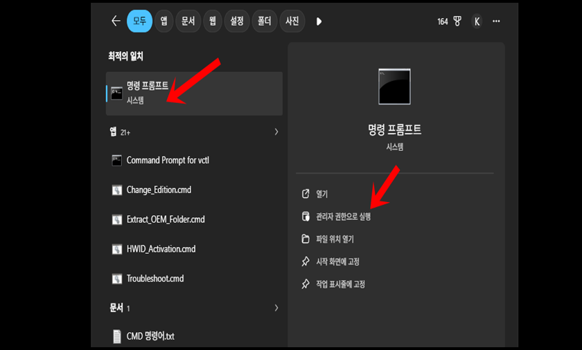 이제는 PC검색창에 "CMD"라고 검색을 하신 후 명령프롬프트를 "관리자 권한으로 실행"해주세요.