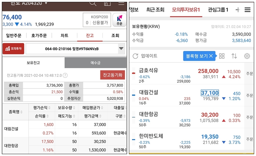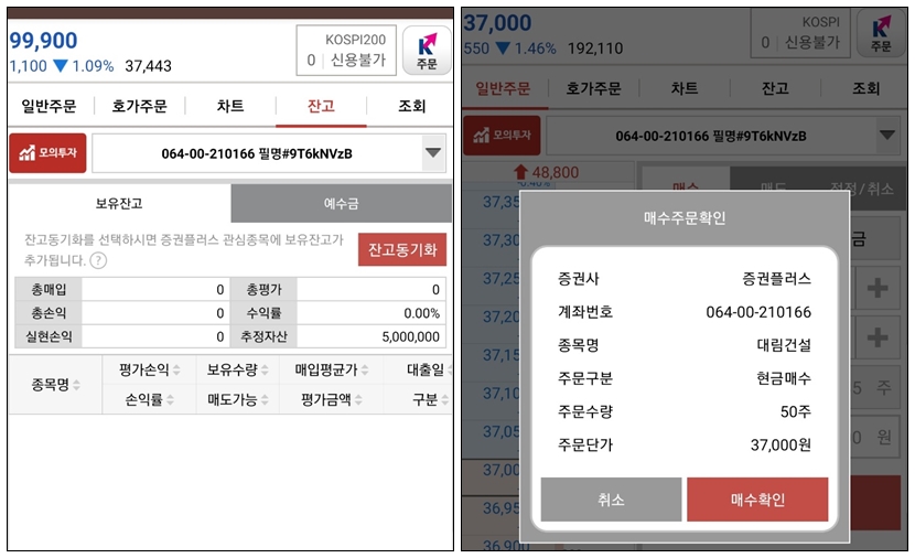 본인이 판단하기에 미래에 성장가치가 있다고 판단되는 종목들을 산뒤, "잔고동기화"를 클릭하시면 "증권플러스"어플과 동기화가 되요. 증권플러스 어플로 들어가면 상단메뉴에서 "모의투자보유1"이라는 탭이 생기는데, 여러분들이 진행하는 모의투자가 진행되고 있음을 확인할 수 있어요.