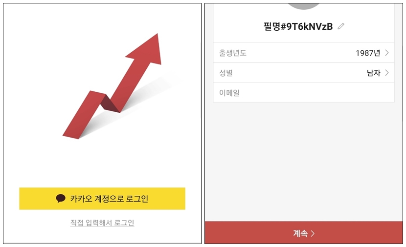 "증권플러스"어플을 실행하시면 "카카오 계정으로 로그인"으로 클릭한 다음 출생년도, 성별, 기타등 작성하셔도 되고 안하셔도 되요^^. "계속"을 클릭하여 넘어가주세요.