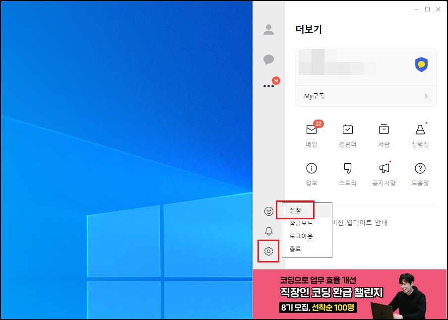 우선 카카오톡 멀티 프로필을 이용하기 위해선 카카오톡 지갑에 가입을 하셔야 돼요. 카카오톡 지갑에 가입을 하셨다는 가정하에 PC버전에서 설명드릴게요.(모바일과 큰 차이 없으니 걱정하지 않으셔도 돼요.) 우선 PC카카오톡을 실행 후 메신저 하단의 톱니바퀴를 클릭하여 [설정] 메뉴로 들어가 주세요.