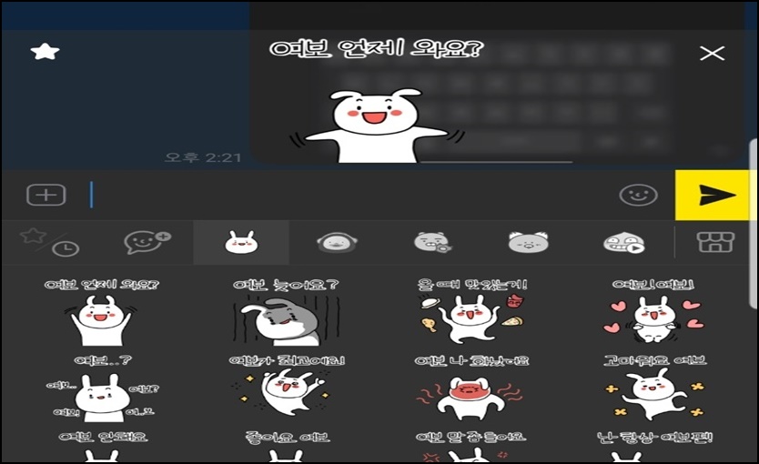 채팅방에 + 버튼을 클릭 후 마음에 드는 이모티콘을 선택해주세요.