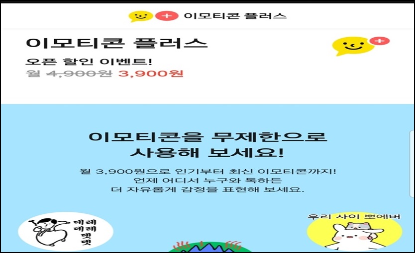 월 3,900원으로 인기부터 최신 이모티콘까지 언제 어디서 누구와 톡 하든 더 자유롭게 감정을 표현해보세요^^.
