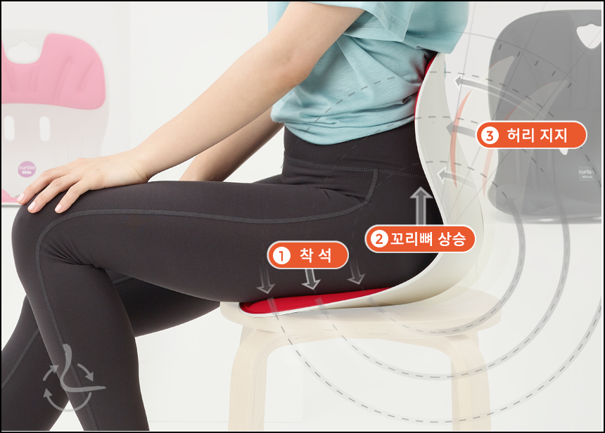 커블 체어는 의자에 착석을 하면 본인의 하중으로 인해 뒤쪽의 허리 지지대가 자연스럽게 허리를 밀어주어 바른 자세를 만들어주는 원리예요. 더욱 효과적으로 사용하시려면 허리받침과 커블 체어의 간격을 10~15cm 정도 두고 앉아주시면 바른 자세 교정에 도움이 된다고 해요.