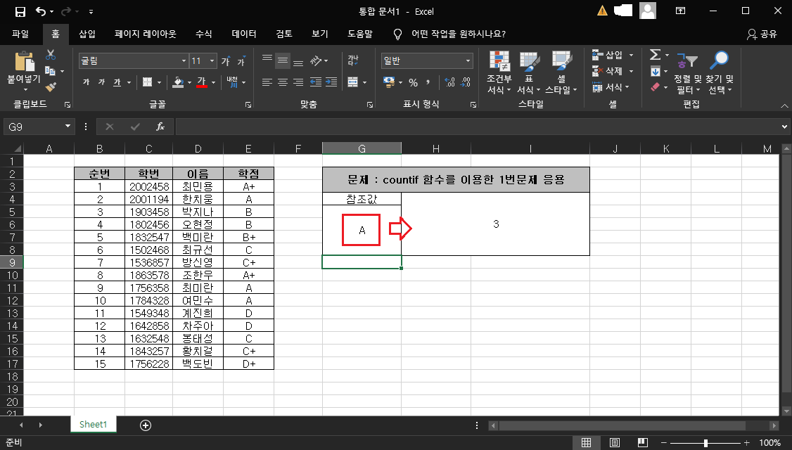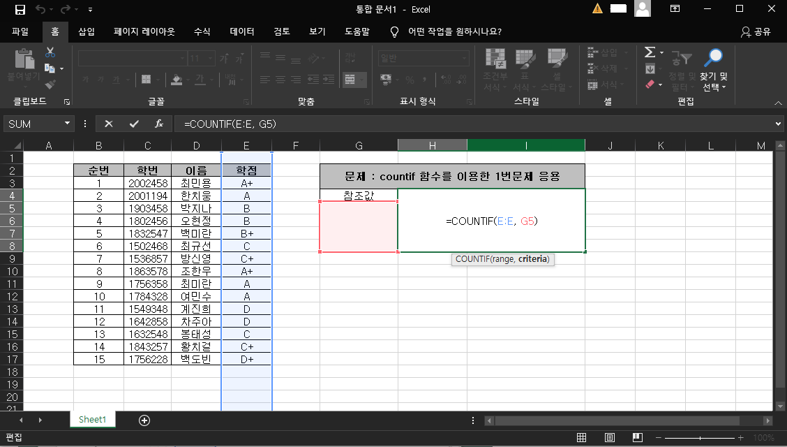 1번 문제를 통해 A학점의 개수를 구할 수 있었는데, B+ , B , C+ C , D+ , D 학점의 개수를 구하려면 똑같은 작업을 6번이나 더해야 하는 번거로움이 생기겠죠? 그래서 약간의 응용을 통해 참조값에 참조할 데이터만 입력 시 바로 출력할 수 있도록 해볼게요.