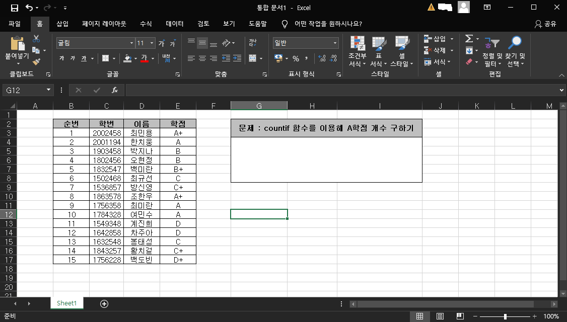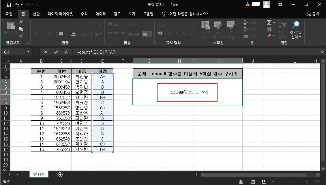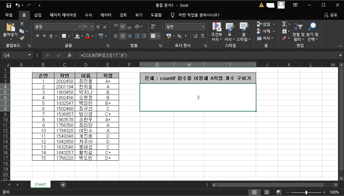 1. 문제 : countif 함수를 이용해 A학점 개수 구하기
