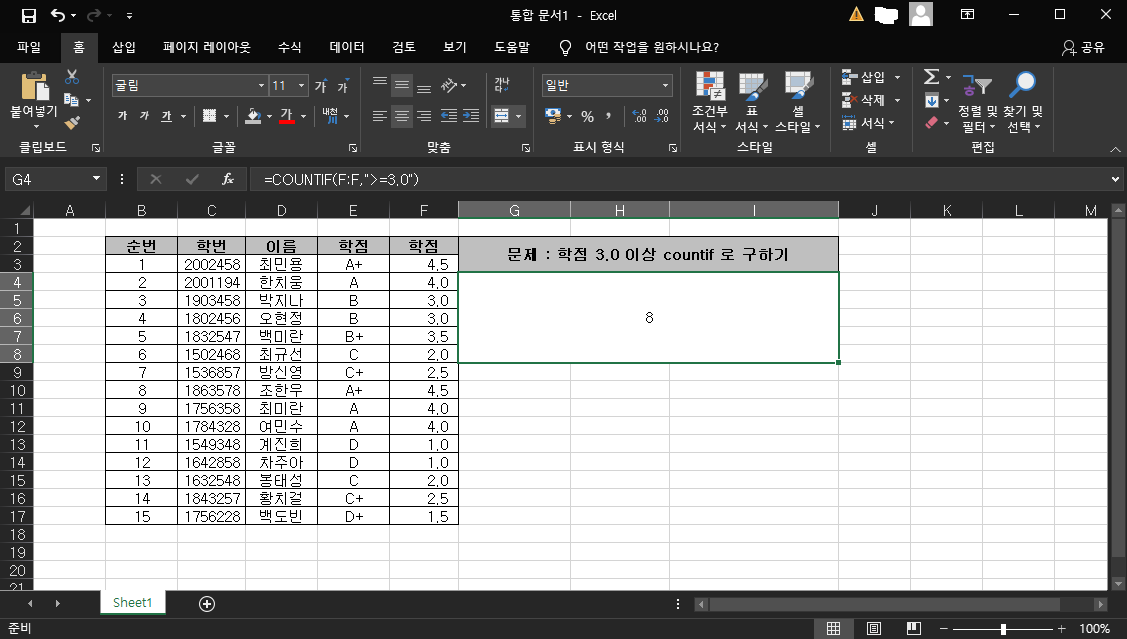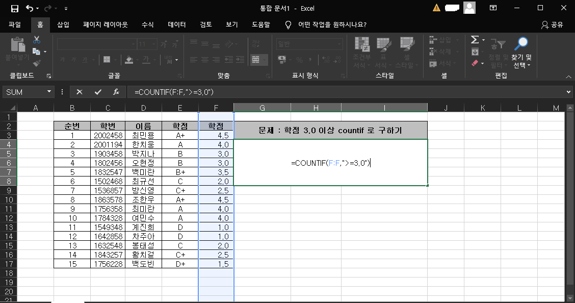 이제 G5 참조값 부분에 각 학점을 입력 시 개수를 즉시 검출할 수가 있어요. 지금까지 정말 쉬웠죠?^^
