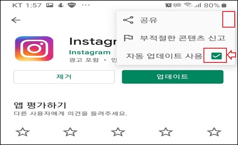 다음 Play 스토어에 들어가신 뒤 "인스타그램"검색 후 상단의... 메뉴를 클릭 후 위 사진에 보시면 "자동 업데이트 사용"부분이 체크가 되어 있을 텐데, 체크박스를 해주세요. 그래야 인스타그램이 업데이트되는 걸 방지할 수 있어요.