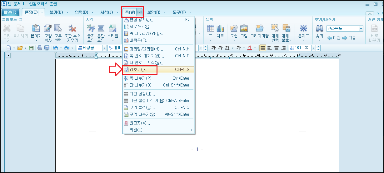 첫 페이지를 클릭 후 상단의 [쪽] -> [감추기] 메뉴를 클릭해주세요.