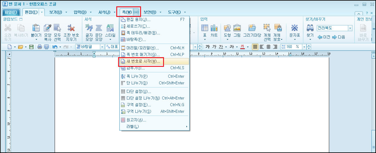다시 2페이지를 선택 후 상단의 [쪽] -> [새 번호로 시작] 메뉴를 클릭해주세요.
