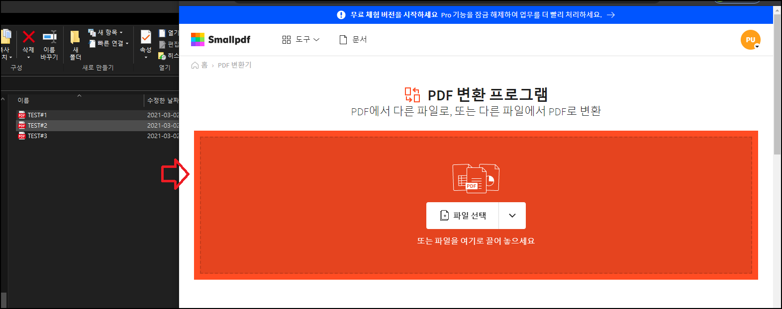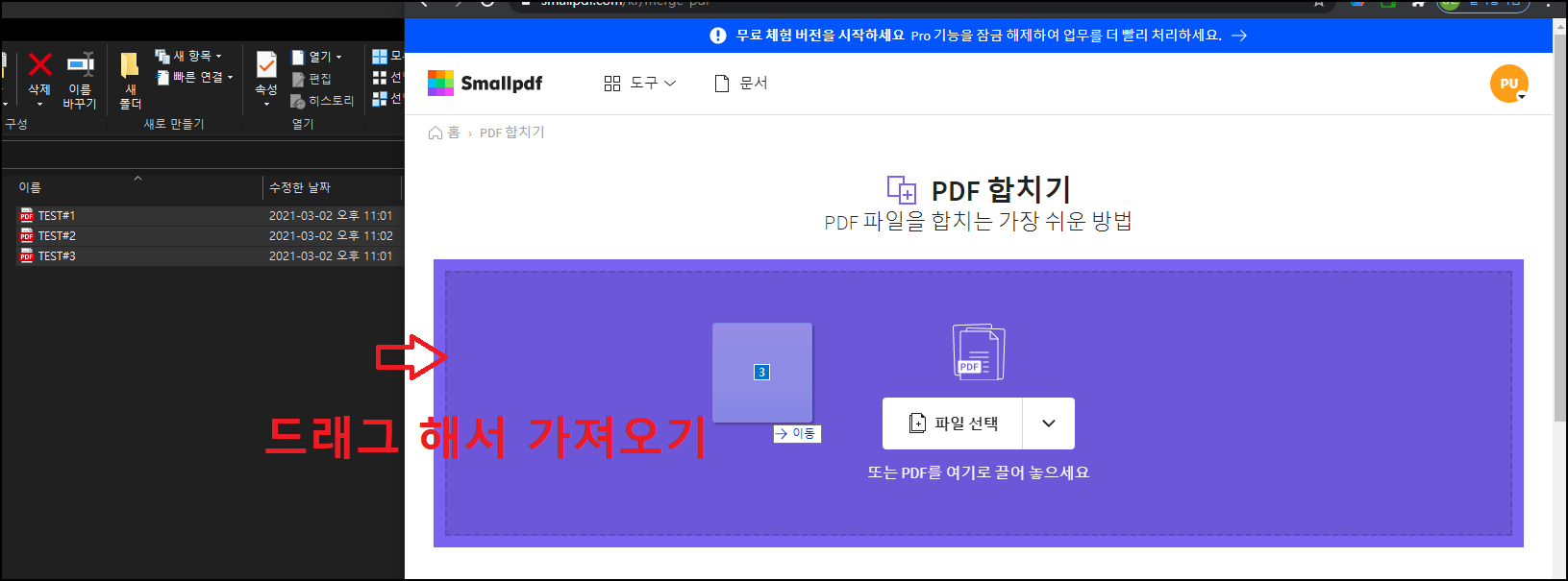 합치고 싶은 PDF파일들을 드래그해서 오른쪽 웹페이지로 이동시켜주세요.