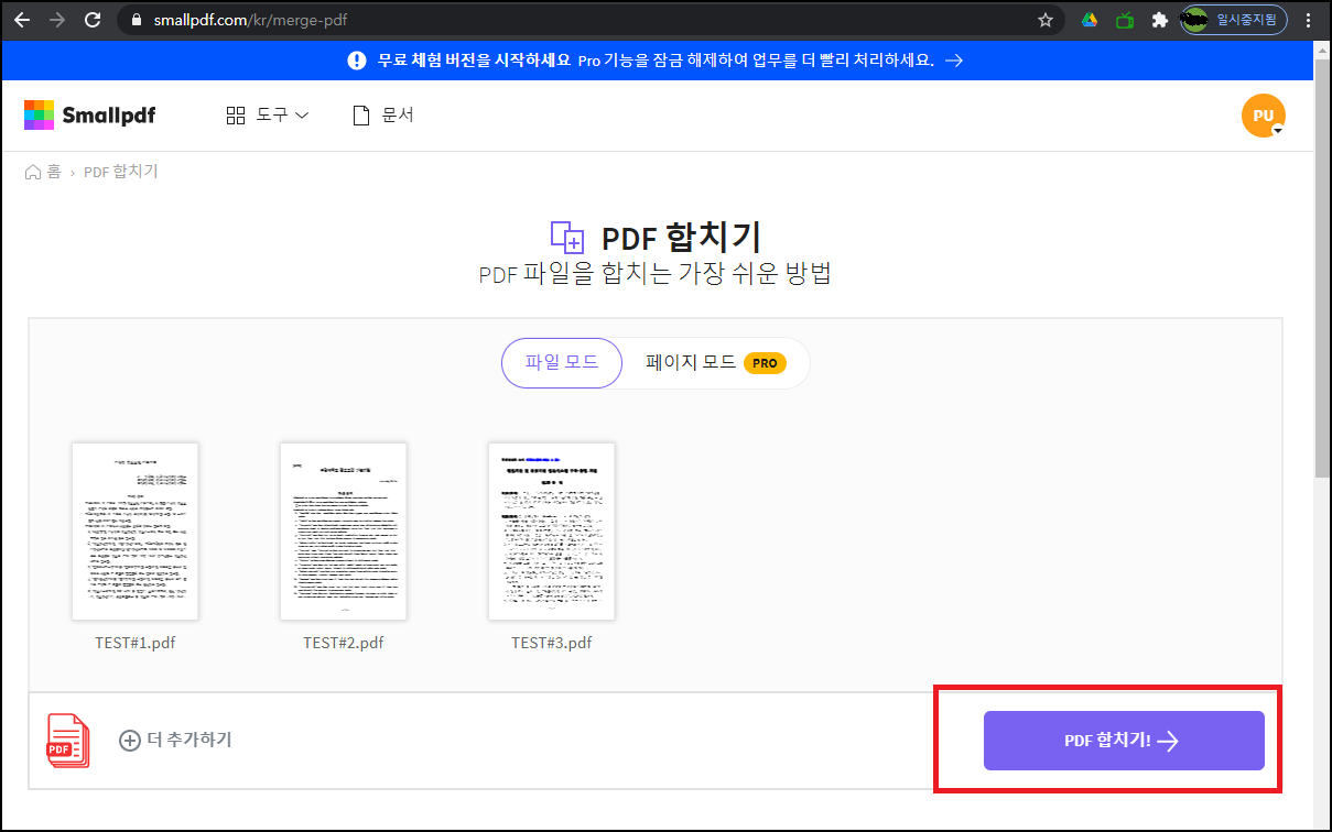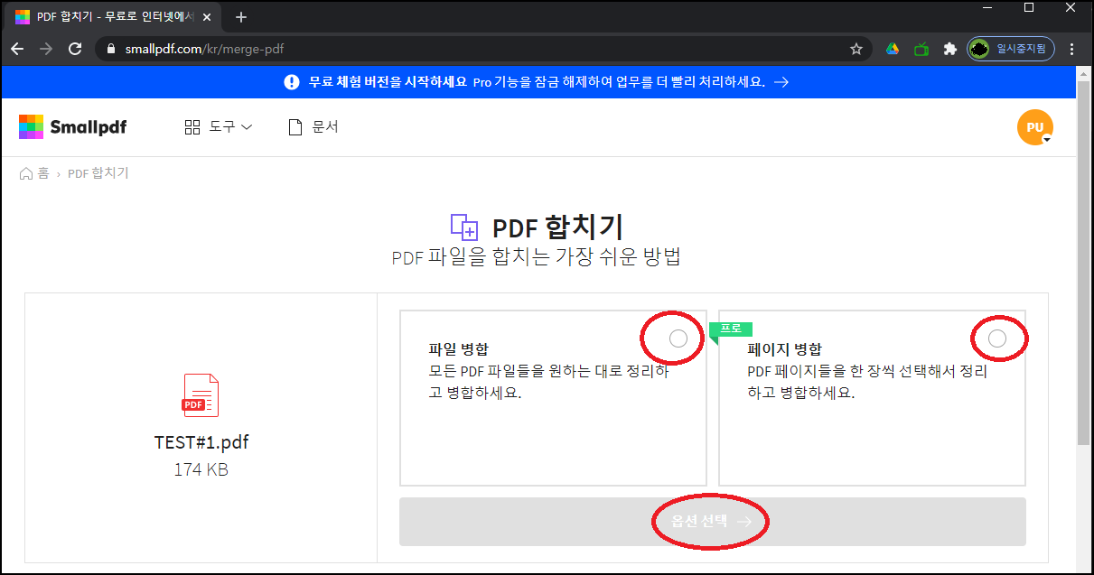 PDF 파일을 파일로 병합할 건지, 페이지별로 병합할 건지 선택할 수 있는데, 사용하시는 분의 편의에 맞게 체크 후 사용하시면 될 것 같아요. 저는 테스트 목적이기에 [파일 병합]을 선택 후 진행하도록 할게요.