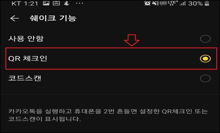 쉐이크 기능에서 [QR 체크인]을 선택해주세요.