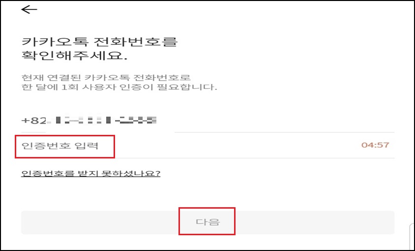 카카오톡 전화번호 확인후 [인증번호]를 입력 후 [다음]버튼을 클릭해주세요.