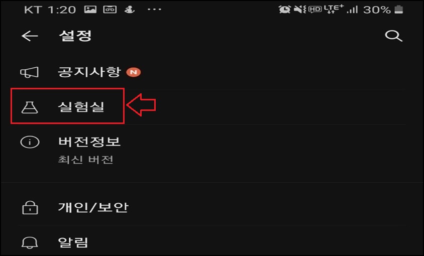 설정들어가시면 상단부분에 [실험실]메뉴가 보일텐데 클릭해서 들어가주세요.