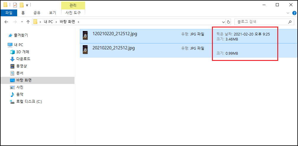 첫 번째 파일이 원본 파일 두 번째 파일이 사진 용량을 줄인 파일이에요. 71% 용량이 줄어들었어요. 정말 간편하고 쉽죠?