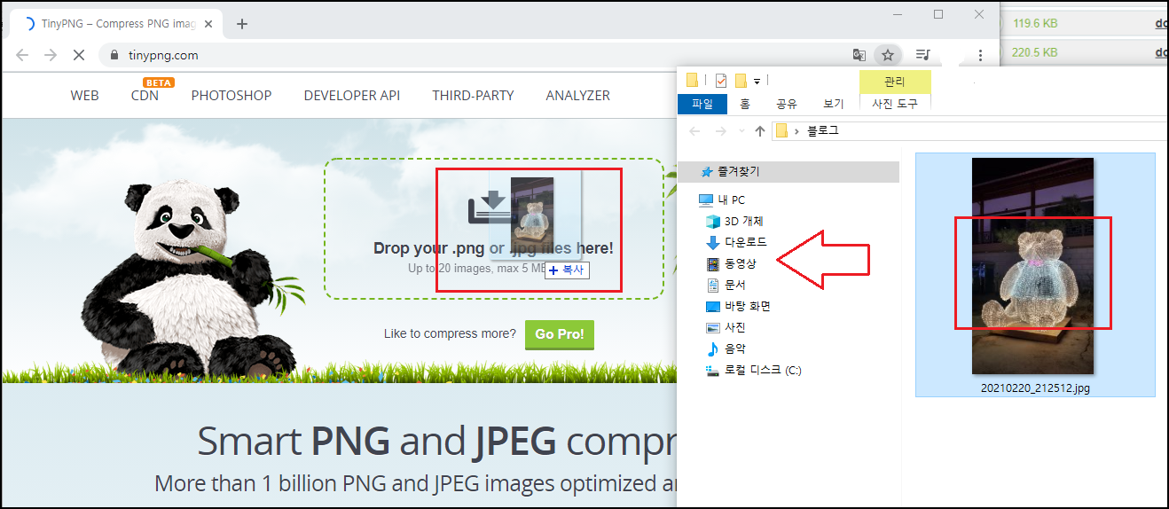 해당 사이트로 이동하시면 영어로 되어 있는데, 별건 없어요^^. 용량을 줄이고 싶은 사진을 드래그해서 메인 화면 [Drop Your.png or jpg files here! 부분에 옮겨주세요.