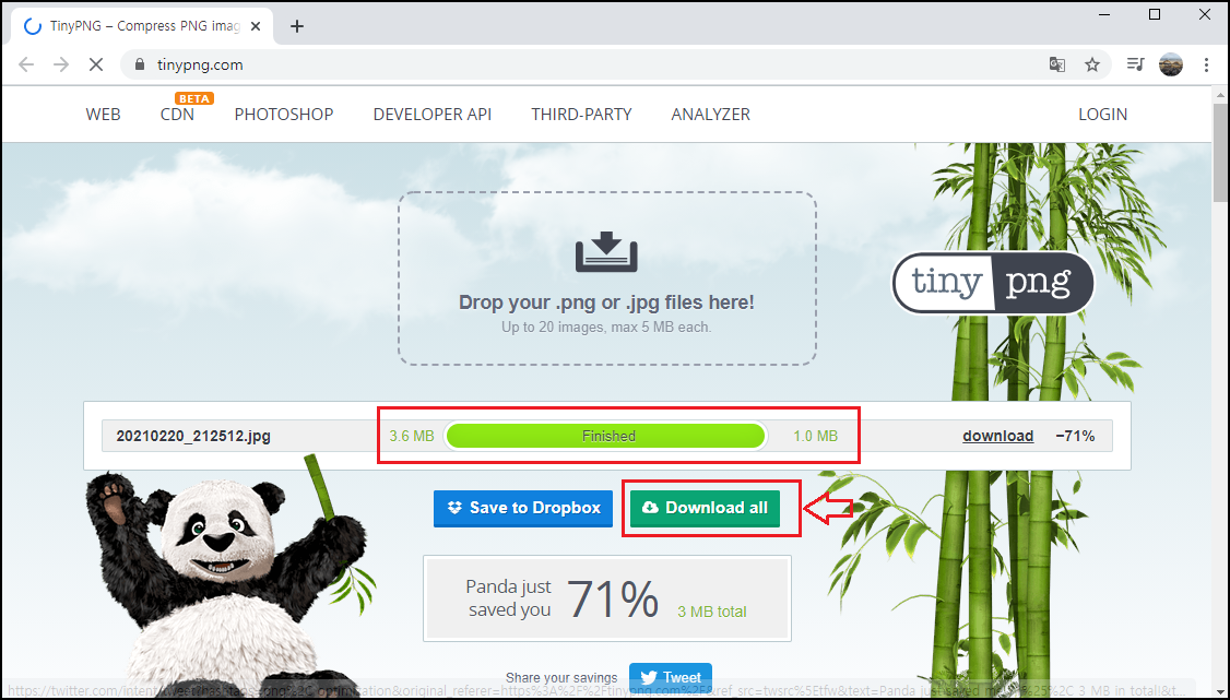 한 번에 20개 사진 파일의 용량을 줄일 수 있는데, 한 개만 올렸을 땐 1초도 안 되는 시간에 용량이 줄어들었어요. Finished가 떨어지면 하단의 [Download all]을 클릭하시면 압축파일로 다운로드가 되는데, 다운로드해서 압축을 풀어주세요.