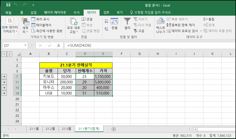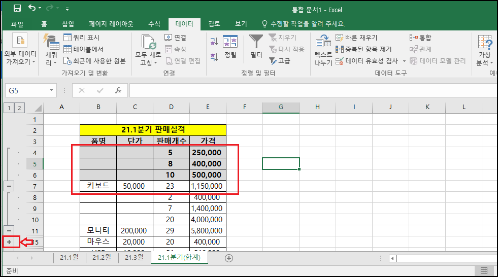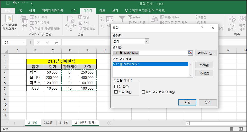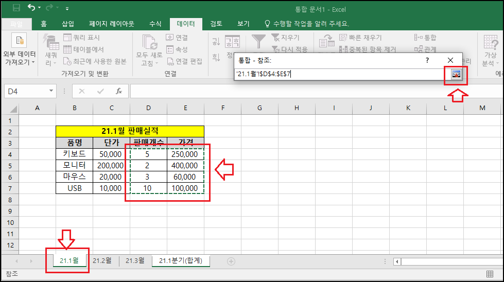 우선 21.1분기(합계) 셀에서 데이터 결괏값을 넣을 셀을 지정후 상단 메뉴에서 [데이터] -> [통합] 메뉴를 클릭해주세요.