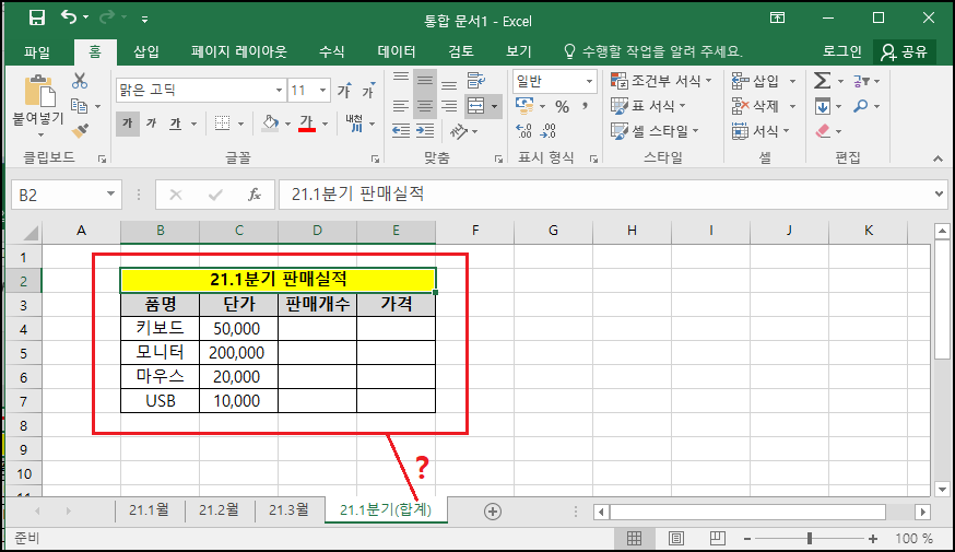 마지막 시트 21.1분기(합계) 시트로 이동해보면 1~3월까지 1분기 동안 판매개수와 가격의 총합계를 구하고 싶은데, 잘 모르는 분들은 1~3월까지 시트를 각각 구해서 더하시는 분들이 계셨을 거예요. 그럼 간단하게 1분기 판매실적을 구해보도록 할게요.