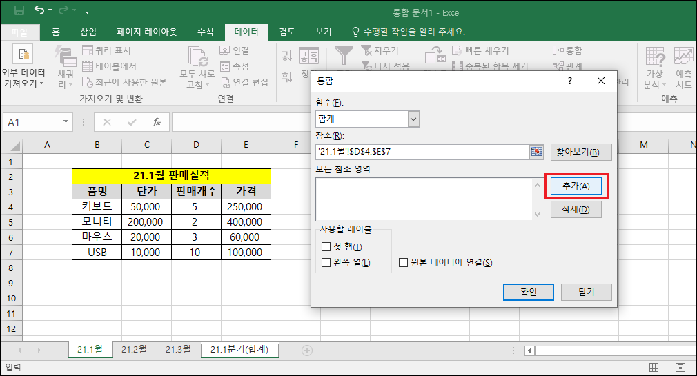 참조 부분에 21.1월 데이터가 선택되었고 [추가] 버튼을 클릭해주세요.