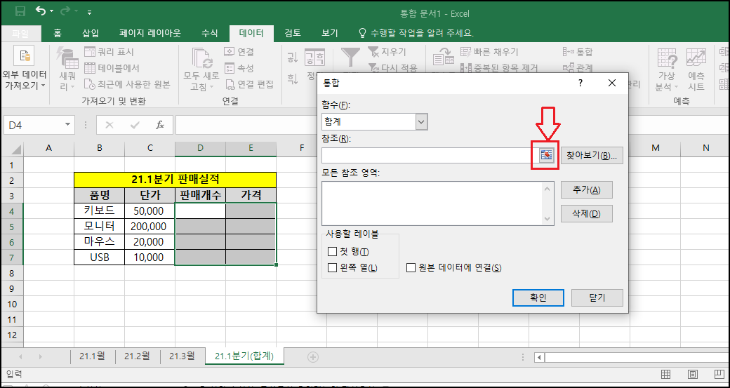 다시 21.1월 시트를 선택 후 판매개수와 가격 셀을 범위 지적을 해주신 뒤 사진과 같이 [참조] 버튼을 다시 클릭해주세요.