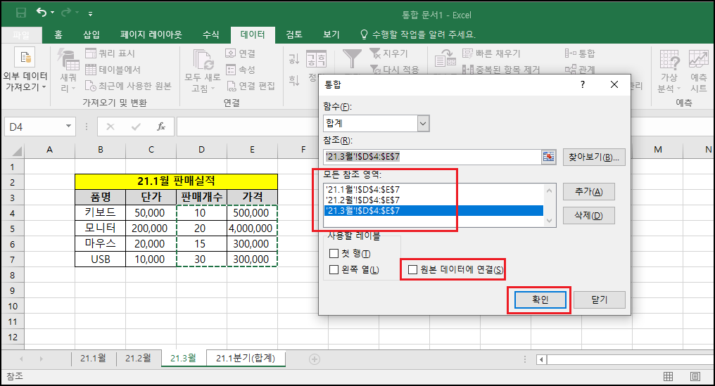 동일한 방법으로 21.2월, 21.3월 시트도 참조하여 추가해주세요. 마지막으로 사용할 레이블을 [원본 데이터 연결]을 선택 후 [확인] 버튼을 클릭하시면 돼요.