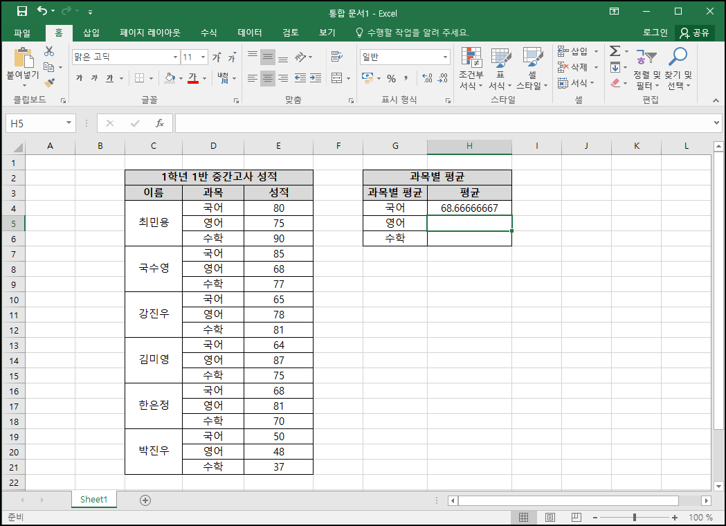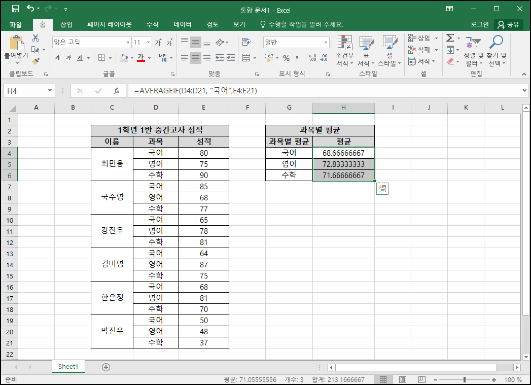 영어, 수학의 과목의 반 평균을 구해졌어요. 생각보다 어렵지 않았죠?^^
