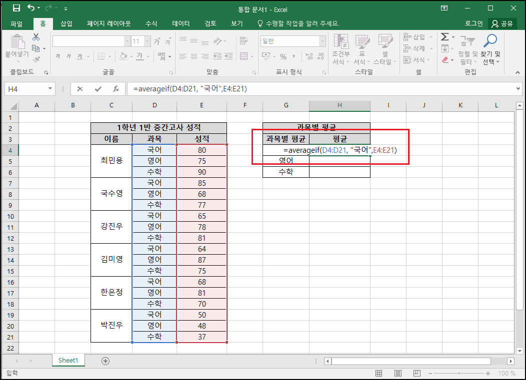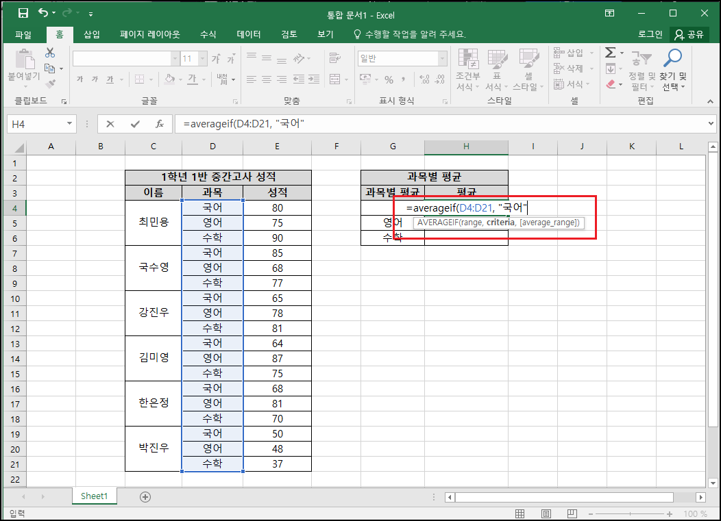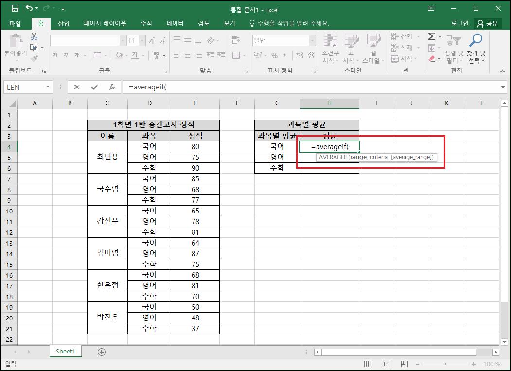 먼저 1학년 1반의 국어 반 평균을 내보도록 할게요. =averageif( 입력해주세요.