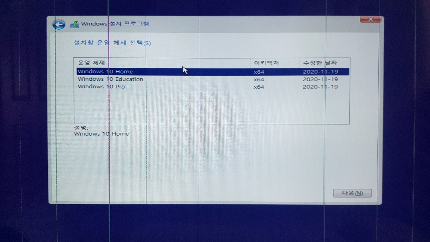윈도 10 Home , Education, Pro 중 하나를 선택해서 [다음]으로 넘어가 주세요. 저의 경우 Windows 10 Pro를 설치하였어요.