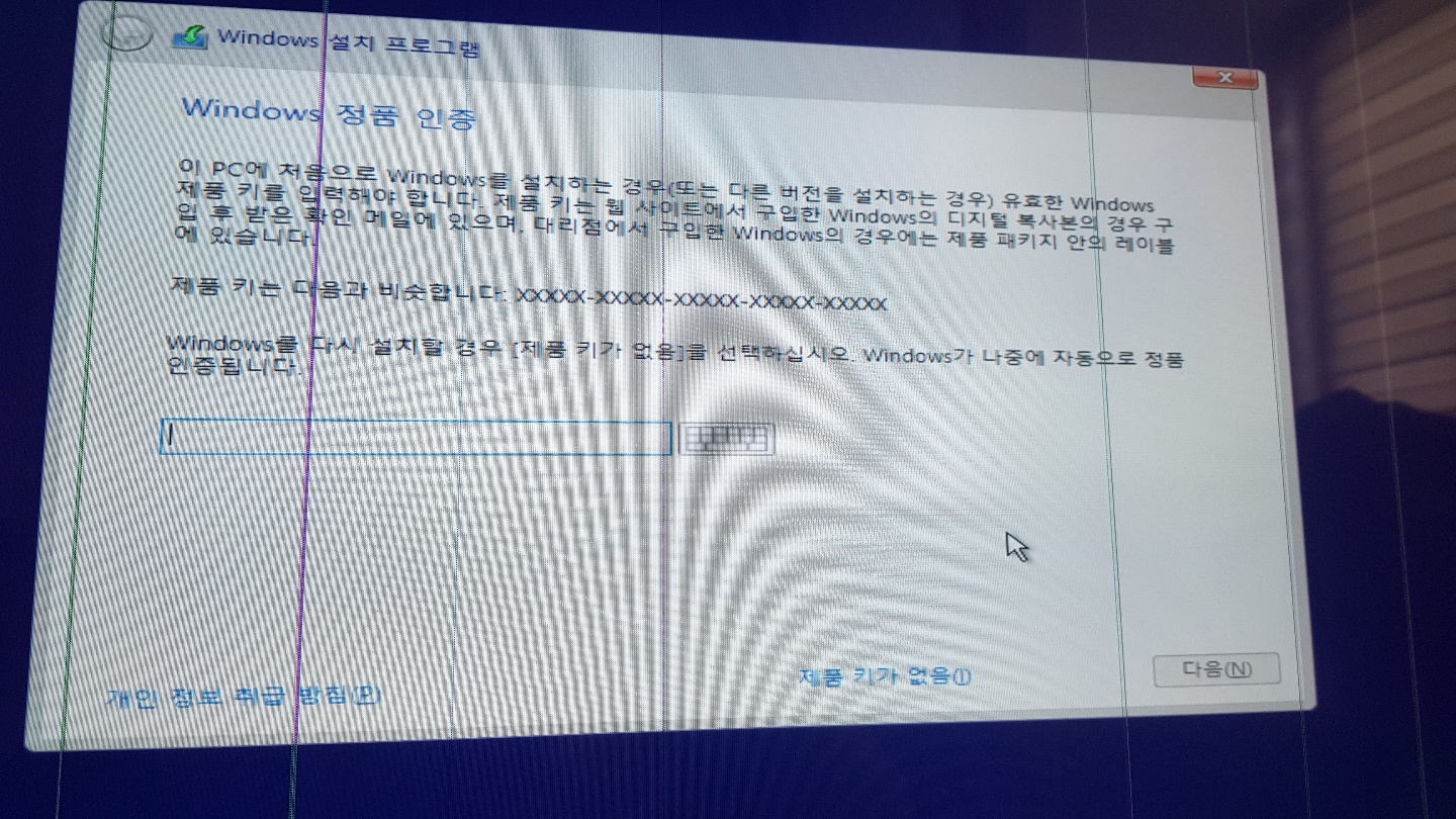 Windows 정품인증을 하라고 나오는데, 우선 [제품 키가 없음]을 선택 후 [다음]으로 넘어가 주세요. 제품키가 있는 분들은 입력하셔도 되고 없는 분들은 윈도 설치 완료 후 아래 포스팅을 확인하여 윈도 10 무료로 정품 인증하는 방법을 진행해주시면 돼요.