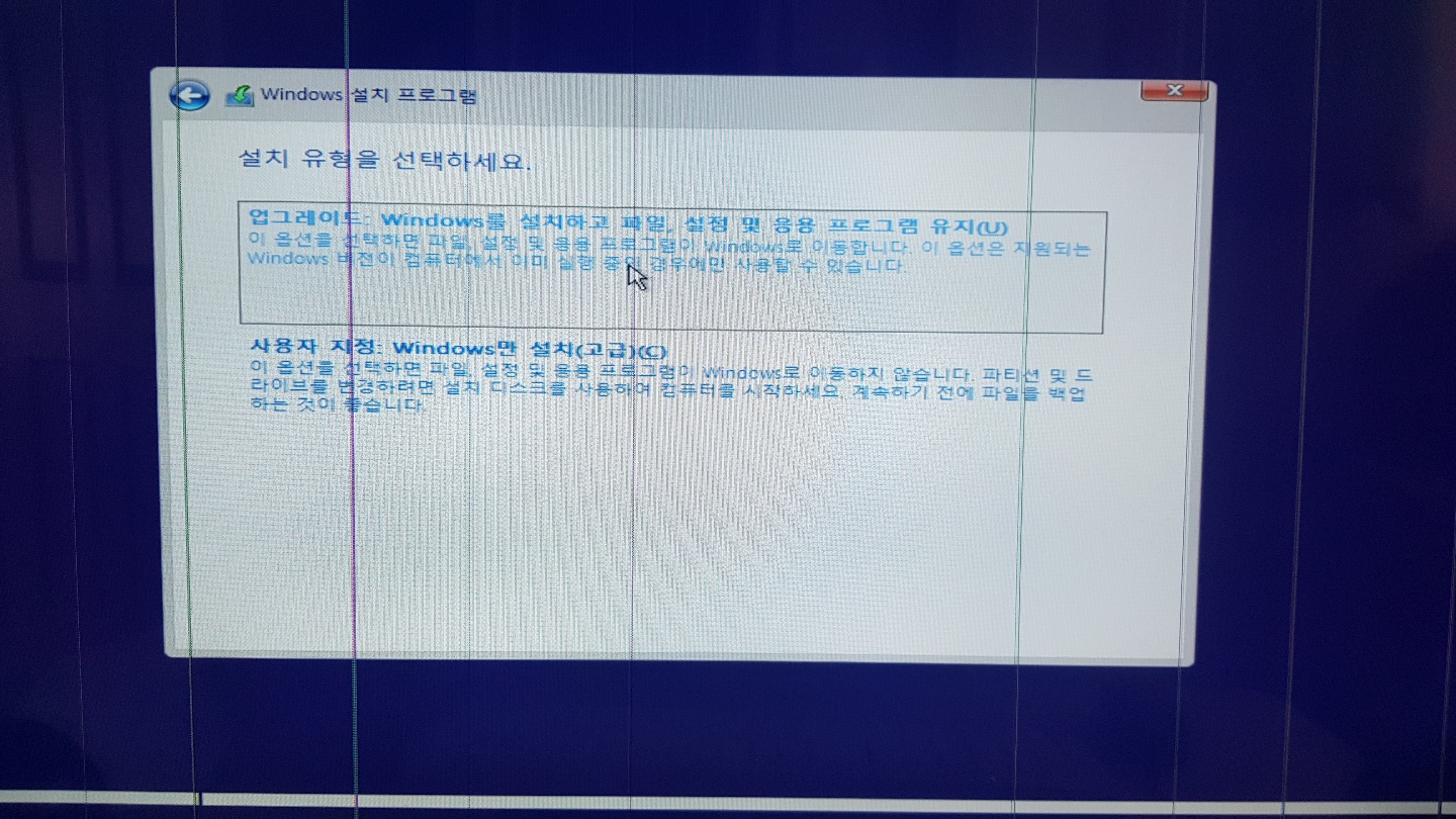 설치 유형을 업그레이드인지 사용자 지정인지 선택할 수 있는데, 전체 포맷 후 재설치하기에 [사용자 지정 : Windows만 설치]를 선택해주세요.