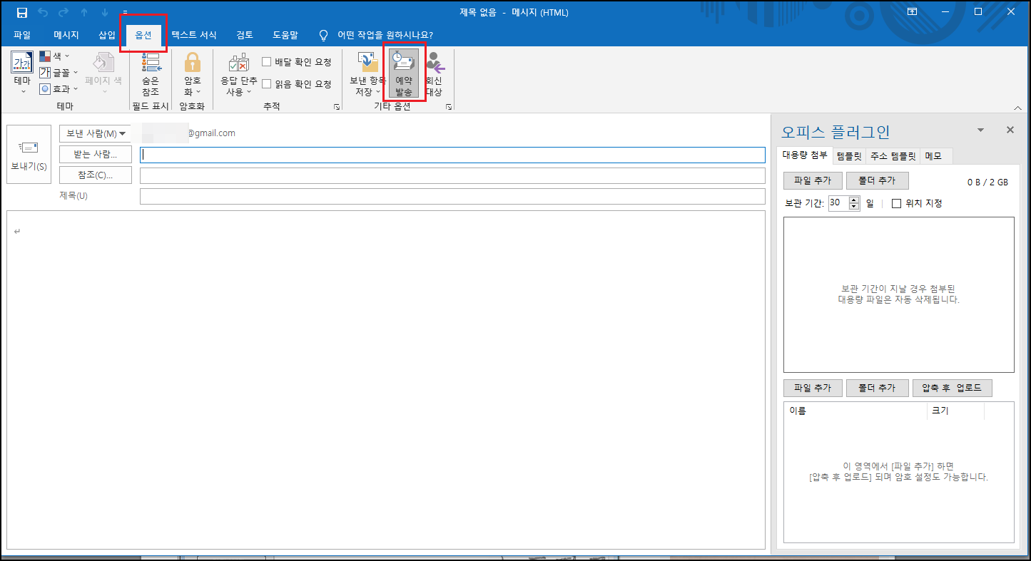 상단 메뉴에서 [옵션] -> [예약발송]메뉴를 클릭해주세요.