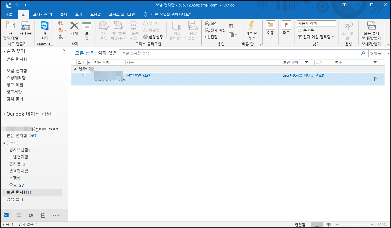 왼쪽 메일에서 [보낼 편지함]으로 들어가 보시면 발송할 메일이 대기 중인 것을 확인할 수 있어요.