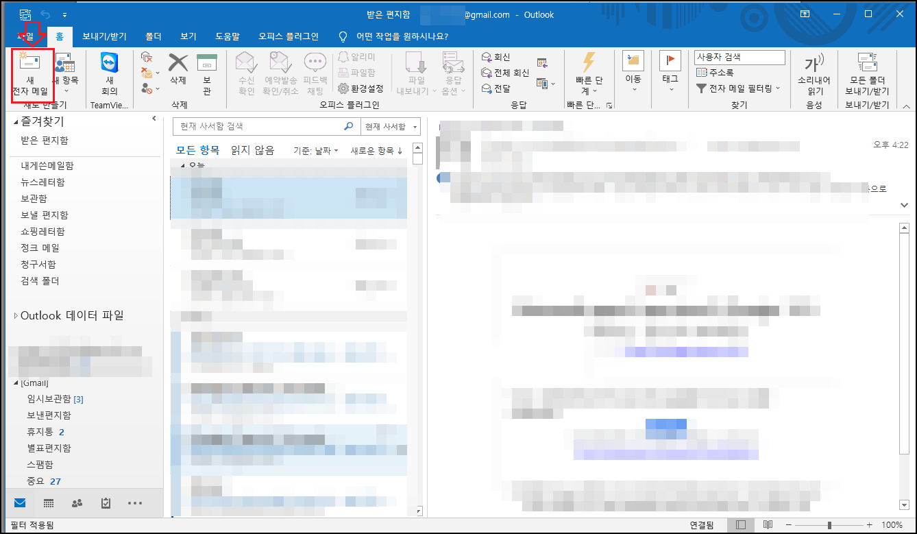 우선 아웃룩 메일에서 상단 메뉴에서 [새 전자메일]을 선택해주세요.