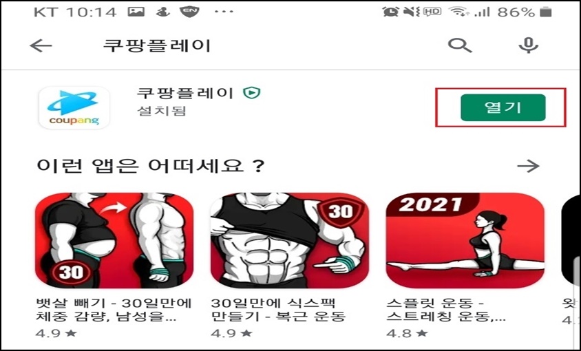 쿠팡 플레이가 설치가 완료되면 [열기]를 선택해주세요.