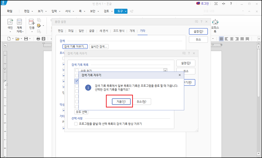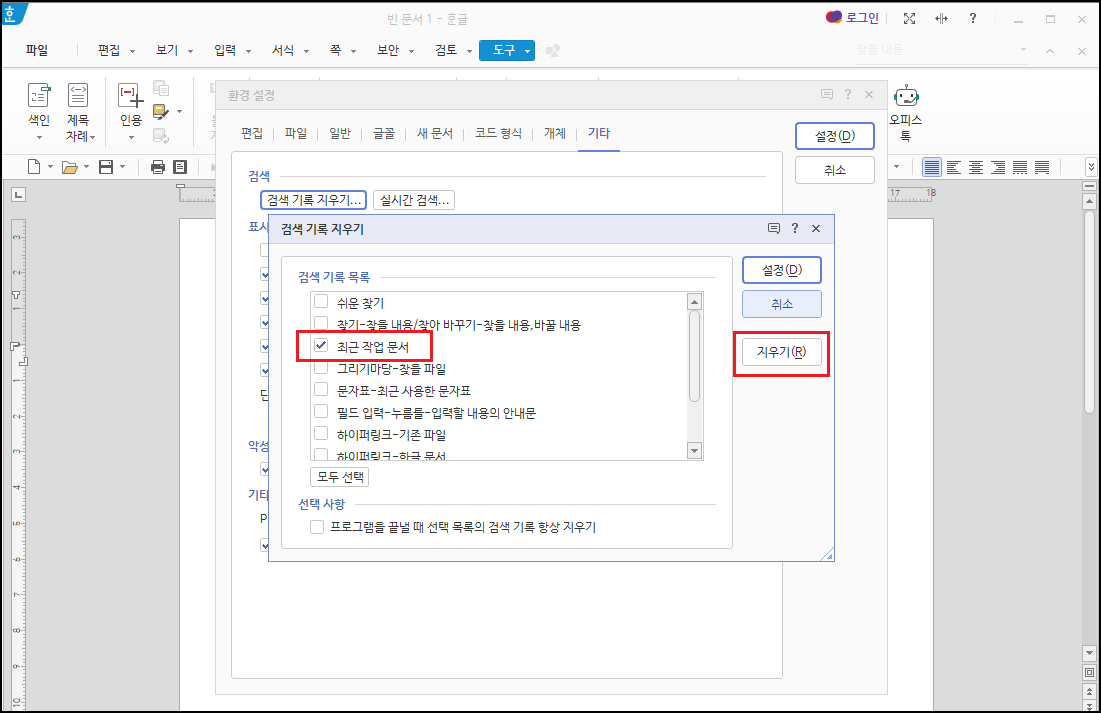 검색 기록 지우기 창이 활성화되면 하위 목록에서 "최근 작업 문서"를 클릭 후 지우기 버튼을 클릭해주세요.