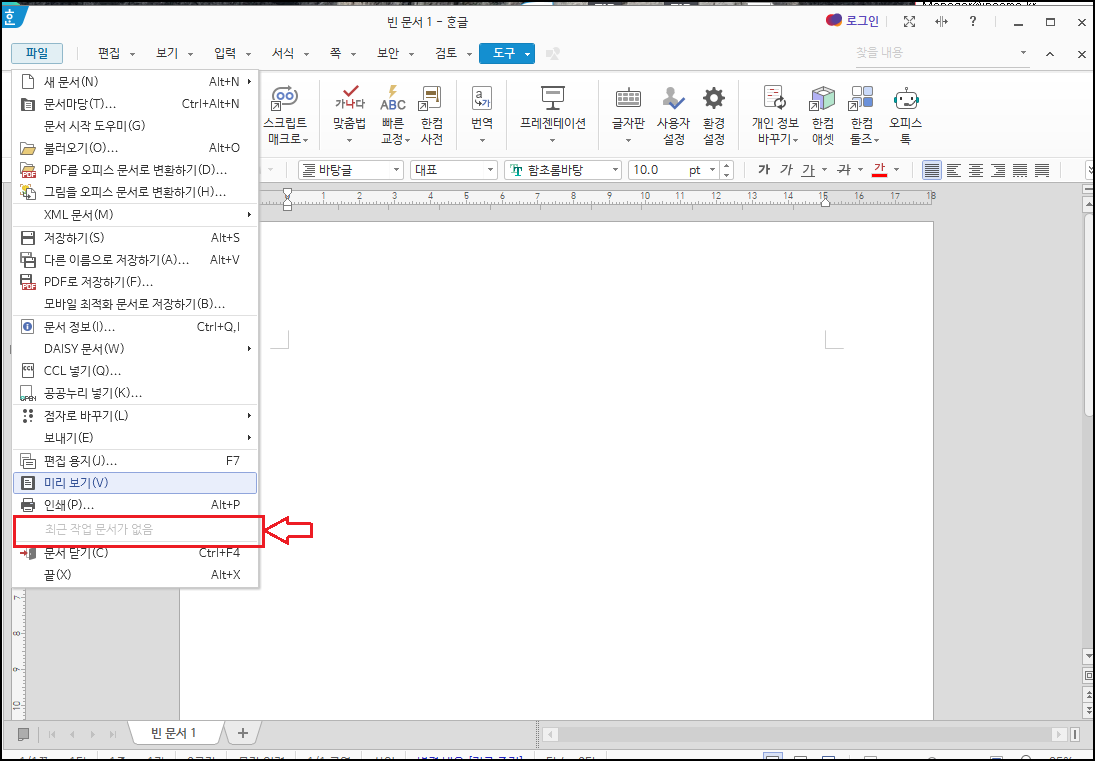 다시 파일 메뉴를 클릭해보시면 "최근 작업 문서가 없음"으로 된것을 확인할 수 있을 거예요.
