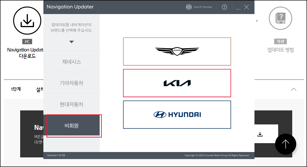 설치 후 프로그램을 실행하면 회원인 경우 제네시스, 기아, 현대에 맞게 로그인하시면 되고 귀찮으시다면 "비회원"으로 선택 후 여러분 차 제조사를 선택해주세요. 저는 기아차 이기에 KIA를 선택해야겠죠?^^