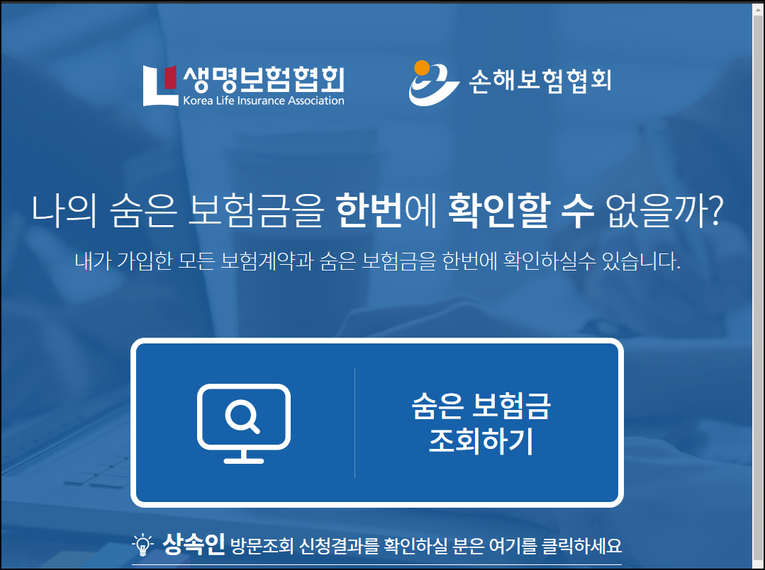 나의 숨은 보험금을 한번에 확인할 수 없을까? 내가 가입한 모든 보험계약과 숨은 보험금을 한번에 확인하실수 있습니다. 숨은 보험금조회하기 상속인 방문조회 신청결과를 확인하실 분은 여기