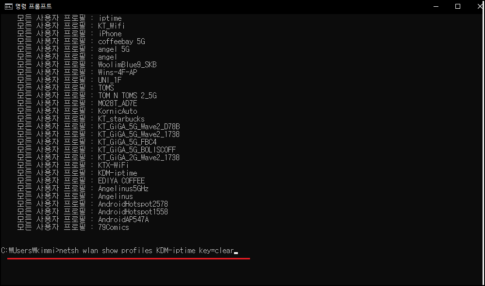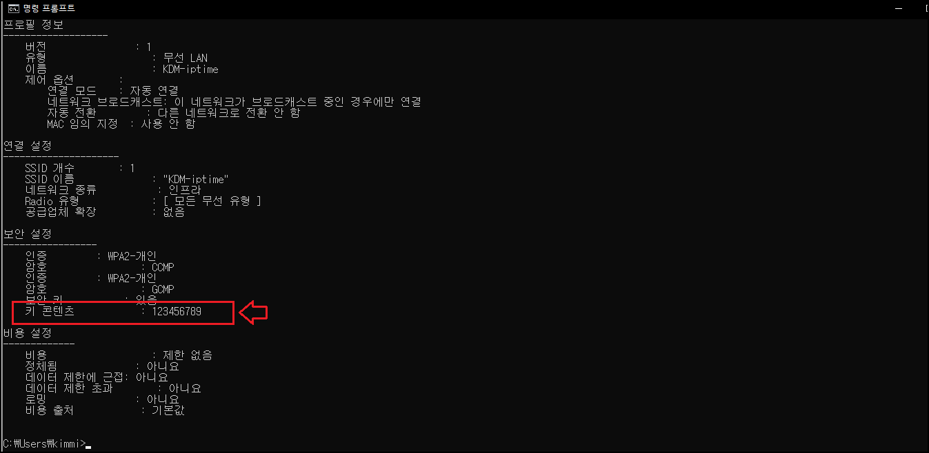 검색창에 다시 [ netsh wlan show profies KDM-iptime key=clear ] 명령어를 치시면 KDM-iptime 와이파이의 패스워드를 확인할 수 있어요.