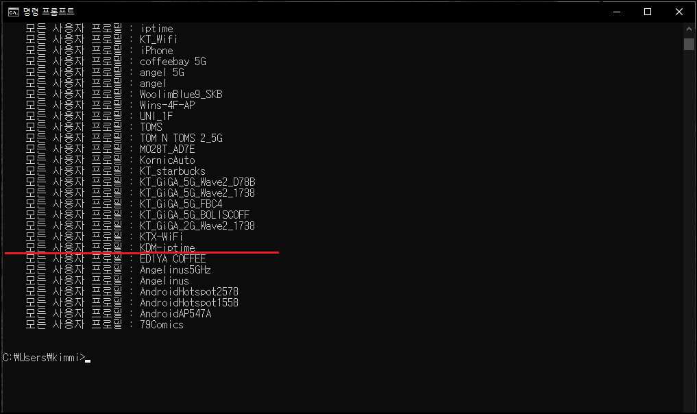 그러면 지금까지 본인 PC에서 사용했던 와이파이 목록을 확인할수 있어요. 그렇다면 이 사용했던 와이파이의 각각 패스워드를 알아볼까요? 우선 KDM-iptime 이름으로 사용했던 와이파이의 패스워드를 알아보도록 하죠.
